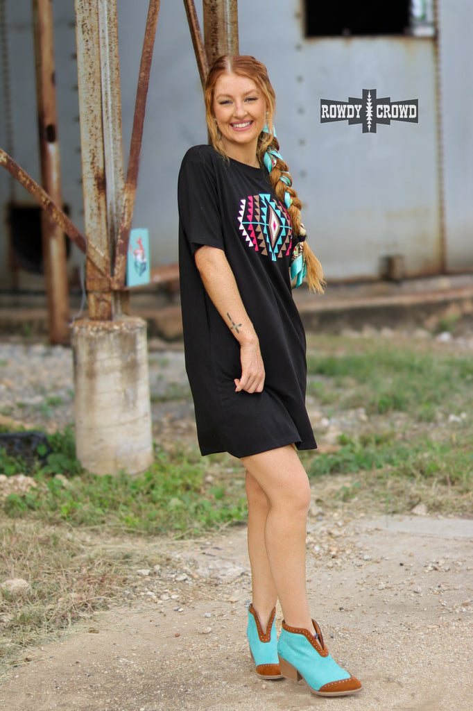 turn heads with the Desert Rose Dress! This t-shirt style dress has a knitted aztec design and can easily be paired with your favorite duster. Whether you're attending a concert or enjoying a casual day out, this dress adds a touch of western elegance to any occasion!