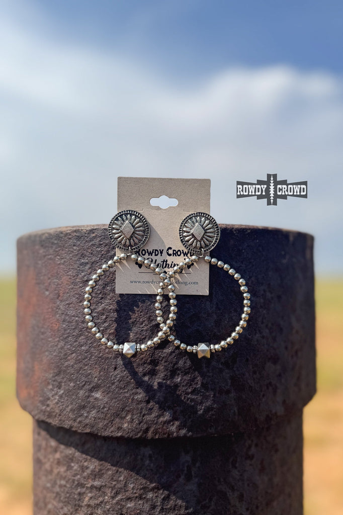 Ride into timeless Western style with these stunning High Horse Hoops featuring classic silver concho studs and dangling beaded hoops, complete with a bold center bead. Perfect for festivals, rodeos, or everyday wear.
