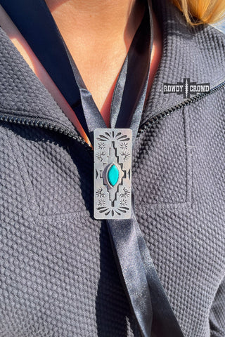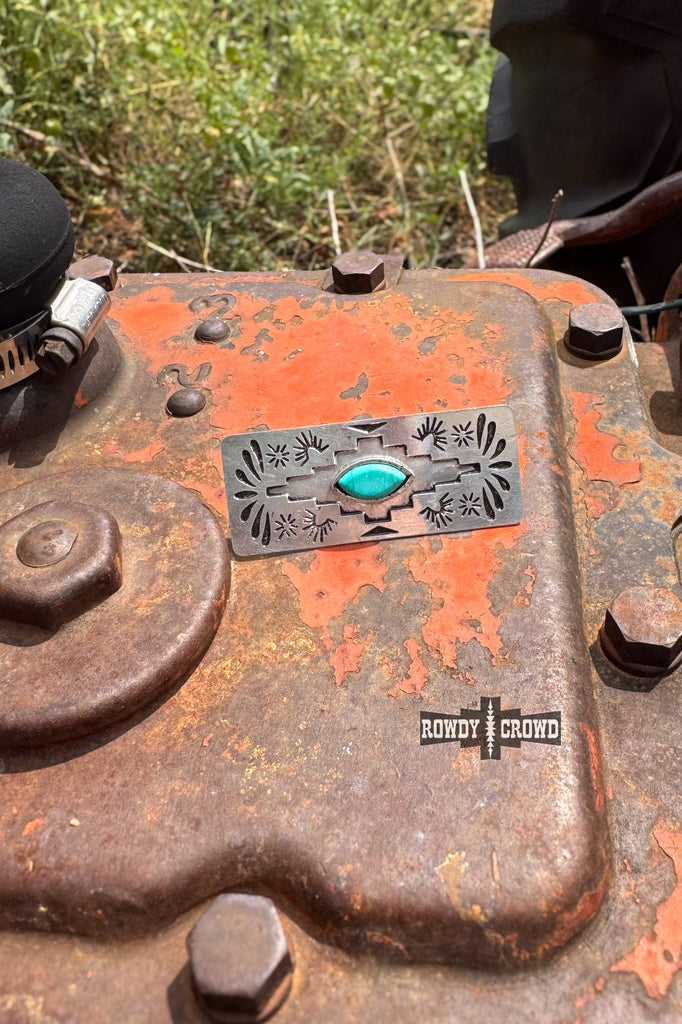 The Saguaro Scarf Slide showcases a vibrant turquoise bead at its center, framed by bold Aztec stamping and floral-inspired petal and sunburst details on each side. A perfect blend of rugged tradition and refined Western charm.